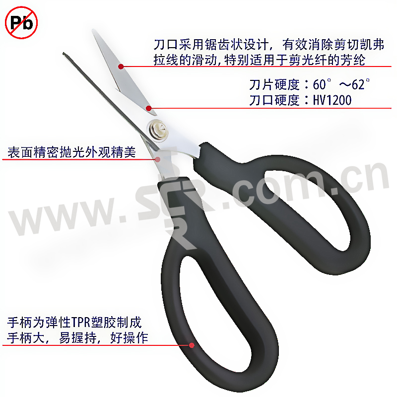 ·刀片以硬度HRC60°~62°高碳钢材质精制,刀口显微硬度高达HV1200。 ·刀口采锯齿状设计,有效消除剪切凯弗拉线的滑动。 ·手柄为弹性塑胶制成,手柄大,易握持,好操作。 ·特别为剪切光纤外层凯弗拉线而打造。