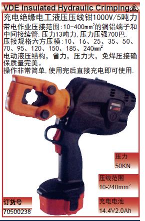 ·充电绝缘电工液压压线钳1000V/5吨力,带电作业压接范围:10-240mm2的铜铝端子和中间接续管.压力5吨力,压力压强600巴. ·压接规格六方压模:10、16、25、35、50、70、95、120、150、185和240mm2钳头可旋转180°自动和手动泄压阀,带电作业压接范围:10-400mm2的铜铝端子和中间接续管.压力13吨力,压力压强700巴. ·压接规格六方压模:10、16、25、35、50、70、95、120、150、185、240、400mm2钳头可旋转180°自动和手动泄压阀,带电