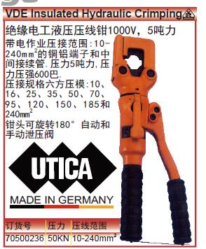 ·绝缘电工液压压线钳1000V,5吨力带电作业压接范围:10-240mm2的铜铝端子和中间接续管.压力5吨力,压力压强600巴.压接规格六方压模:10、16、25、35、50、70、95、120、150、185和240mm2钳头可旋转180°自动和手动泄压阀