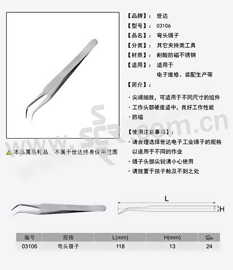 SATA/世达 弯头镊子 SATA-03106 118mm 1支