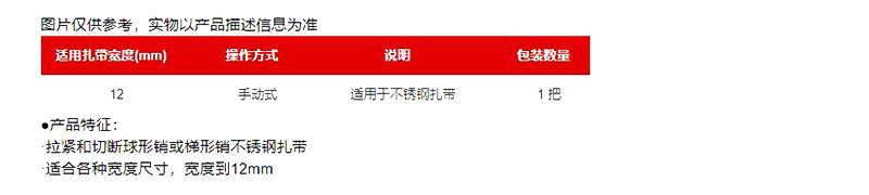 ·拉紧和切断球形销或梯形销不锈钢扎带 ·适合各种宽度尺寸,宽度到12mm
