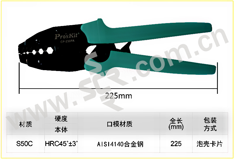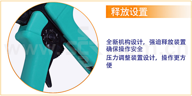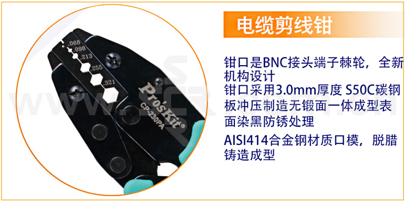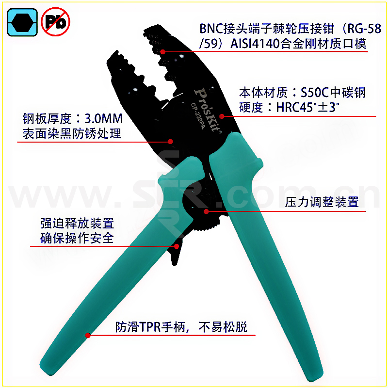 ·全新机构设计,比传统压接钳省力30%。 ·采用3.0mm厚度S50C碳钢板精密冲压制造无锻面一体成型,表面染黑防锈处理。 ·AISI 4140合金钢材质口模,脱腊铸造成型,尺寸精确,口模规格样式齐全。 ·采用6.0mm厚度棘轮片,具压力调整功能,省力耐用。 ·TPR防滑手柄设计,符合人体工学,操作便利不滑手。