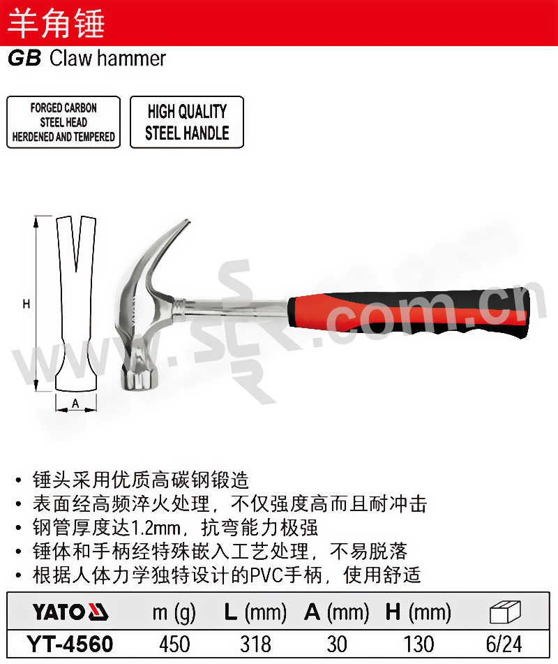 ·锤头采用优质高碳钢锻造。 ·表面经高频淬火处理,不仅强度高而且耐冲击。 ·钢管厚度达1、2mm,抗弯能力强。 ·锤体和手柄经特殊嵌入工艺处理,不易脱落。 ·根据人体力学独特设计的PVC手柄,使用舒适。