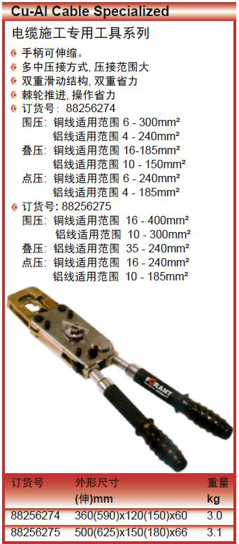 ·手柄可伸缩。多中压接方式,压接范围大双重滑动结构,双重省力棘轮推进,操作省力 ·订货号:88256274围压:铜线适用范围6-300mm²铝线适用范围4-240mm²叠压:铜线适用范围16-185mm²铝线适用范围10-150mm²点压:铜线适用范围6-240mm²铝线适用范围4-185mm² ·订货号:88256275围压:铜线适用范围16-400mm²铝线适用范围10-300mm²叠压:铝线适用范围35-240mm²点压:铜线适用范围16-240mm²铝线适用范围10-185mm²