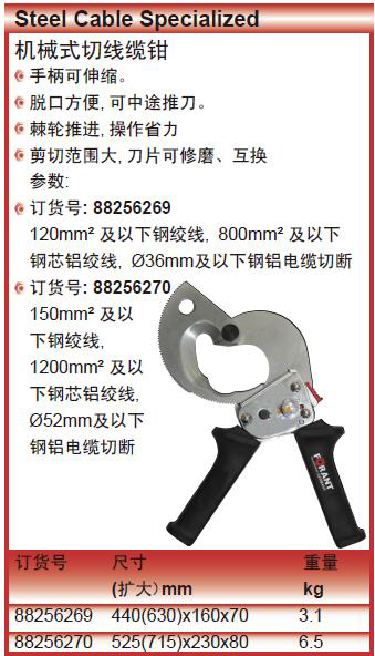 ·手柄可伸缩。 ·脱口方便,可中途推刀。 ·棘轮推进,操作省力 剪切范围大,刀片可修磨、互换 ·参数: ·订货号:88256269120mm²及以下钢绞线,800mm²及以下钢芯铝绞线,Ø36mm及以下钢铝电缆切断 ·订货号:88256270150mm²及以下钢绞线,1200mm²及以下钢芯铝绞线,Ø52mm及以下钢铝电缆切断