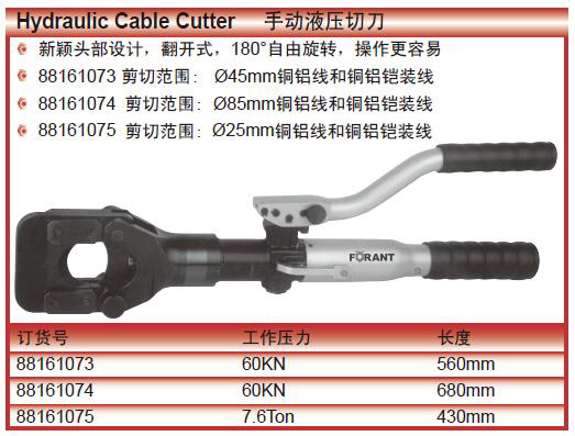 ·新颖头部设计,翻开式,180°自由旋转,操作更容易 ·88161073剪切范围:Ø45mm铜铝线和铜铝铠装线 ·88161074剪切范围:Ø85mm铜铝线和铜铝铠装线 ·88161075剪切范围:Ø25mm铜铝线和铜铝铠装线