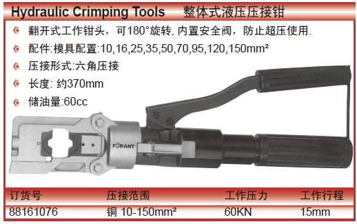 ·翻开式工作钳头,可180°旋转,内置安全阀,防止超压使用. ·配件:模具配置:10,16,25,35,50,70,95,120,150mm² ·压接形式:六角压接 ·长度:约370mm ·储油量:60cc