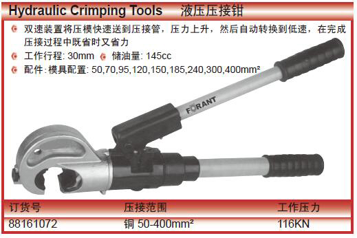·双速装置将压模快速送到压接管,压力上升,然后自动转换到低速,在完成压接过程中既省时又省力 ·工作行程:30mm储油量:145cc ·配件:模具配置:50,70,95,120,150,185,240,300,400mm²