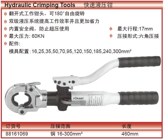 ·翻开式工作钳头,可180°自由旋转双级液压系统提高工作效率并且更加省力内置安全阀,防止超压使用最大行程:17mm最大压力:60KN压接形式:六角压接