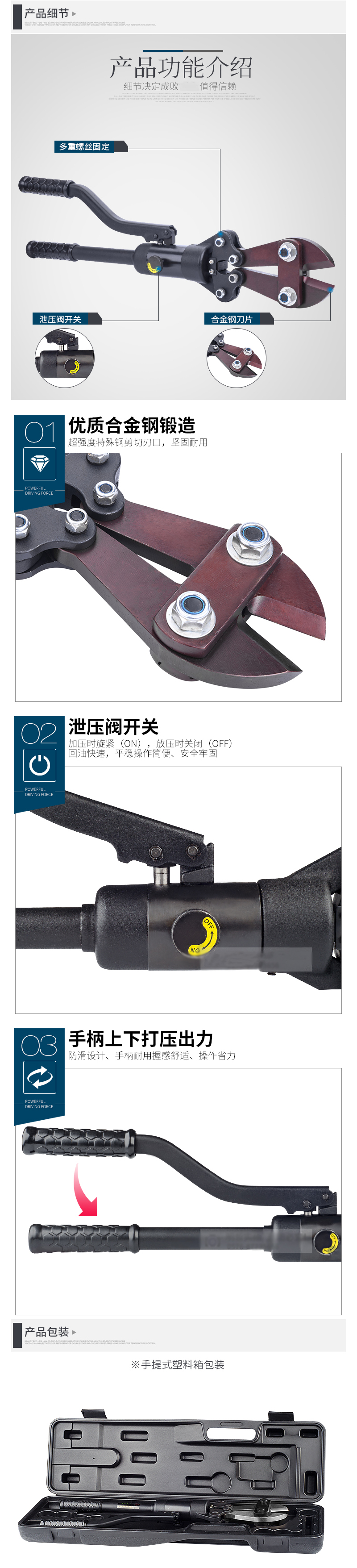 ·剪刀式刀头设计,使用更方便 ·双速装置在完成剪切过程中既省时又省力 ·刀片采用优质特种钢材经热处理加工而成 ·切割完成后,旋转泄压阀即可完成复位