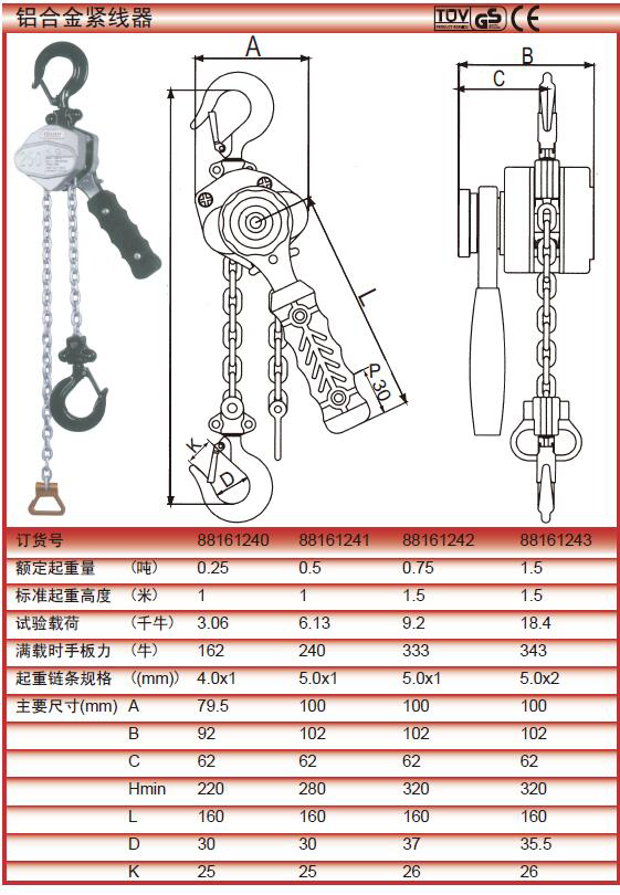 订货号 制造商型号 规格 材质 适用范围 安全载荷 标配起重高度 满载时手板力 起重链条规格 B C Hmin L D K 价格 购物车