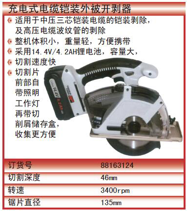 ·适用于中压三芯铠装电缆的铠装剥除, 及高压电缆波纹管的剥除 ·整机体积小,重量轻,方便携带 ·采用14.4V/4.2AH锂电池,容量大, 切割速度快 ·切割片 前部自 带照明 工作灯 再带切 削屑储存盒, 收集更方便