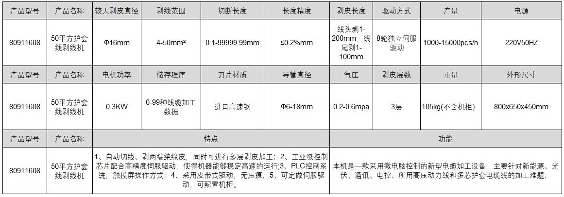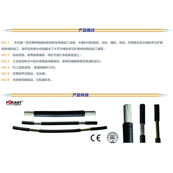 ·自动切线、剥两端绝缘皮,同时可进行多层剥皮加工; ·工业级控制芯片配合高精度伺服驱动,使得机器能够稳定高速的运行; ·PLC控制系统,触摸屏操作方式; ·采用皮带式驱动,无压痕;可定做伺服驱动,可配置机柜。
