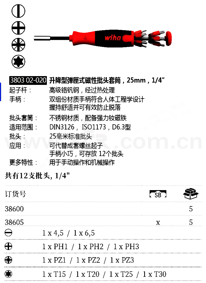·起子杆:高级铬钒钢,经过热处理·手柄:双组份材质手柄符合人体工程学设计握持舒适并可有效防止脱落·批头套筒:不锈钢材质,配备强力钕磁铁·适用范围:DIN3126,ISO1173,D3型·批头:25毫米标准批头·应用:可代替成套螺丝起子手柄小巧可存放12个批头