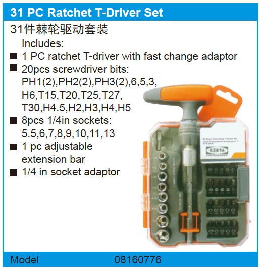 1个PC棘轮T形驱动器 带快速更换适配器 20个起子头: PH1(2) PH2(2) PH3(2) 6 5 3 H6 T15 T20 T25 T27 T30 H4.5 H2 H3 H4 H5 8个1/4英寸插座: 5.5 6 7 8 9 10 11 13 1个可调 延长杆