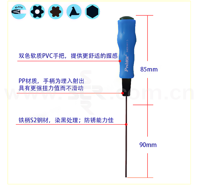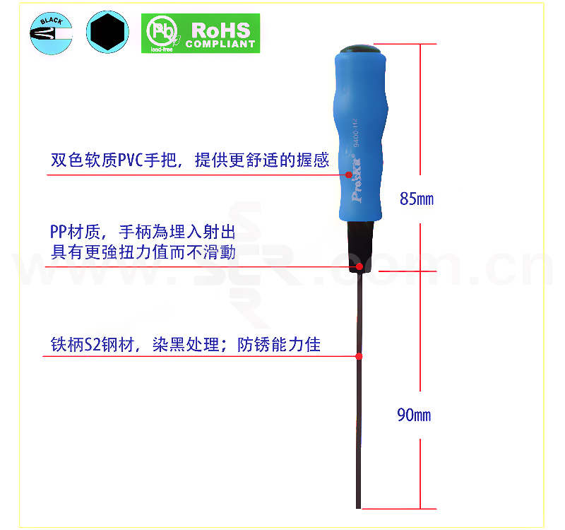·杆部为S2钢材,染黑处理,防锈能力佳。