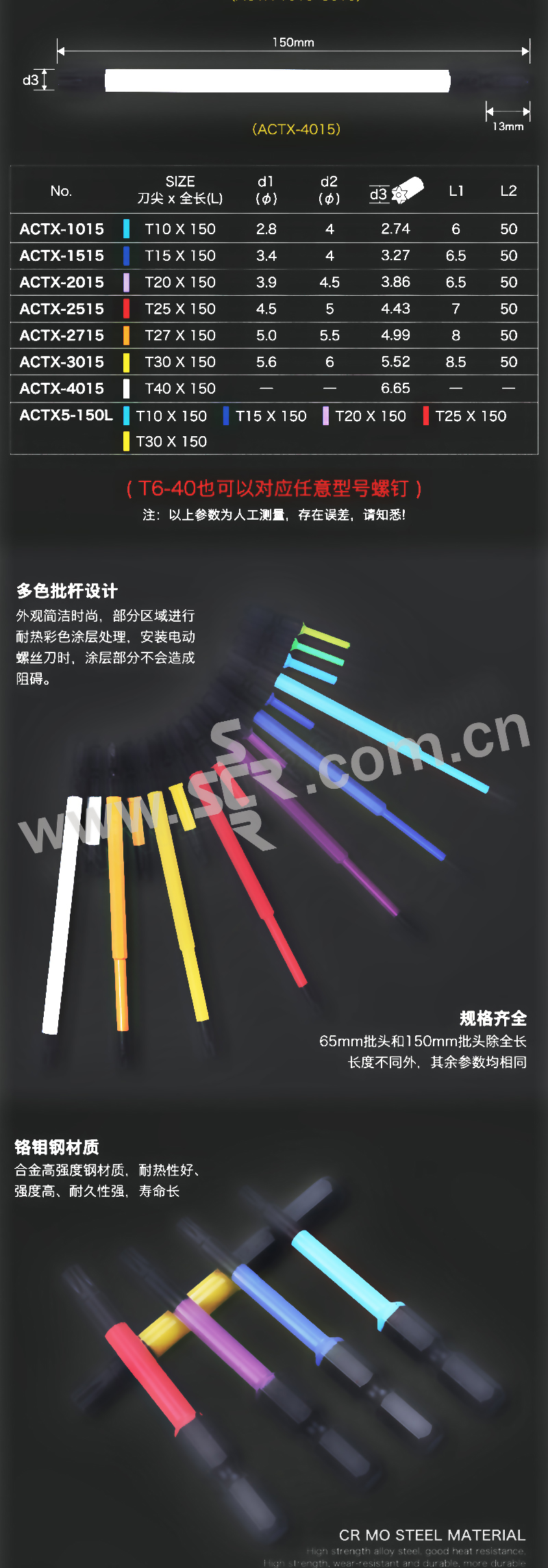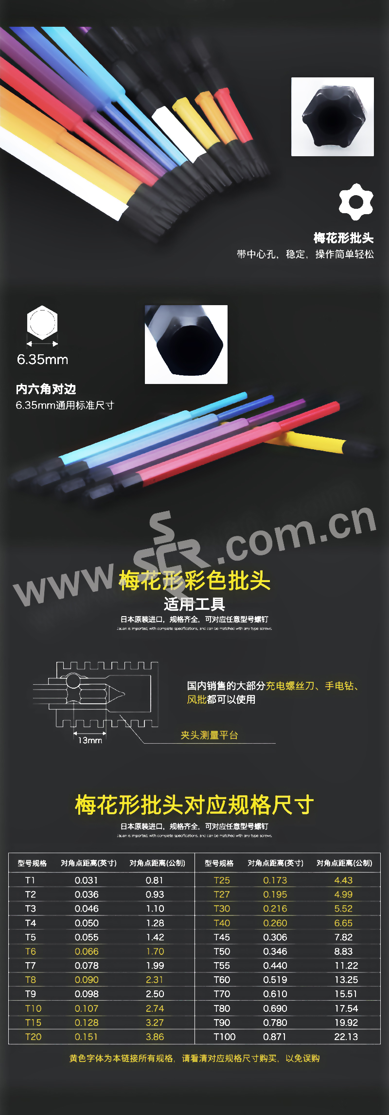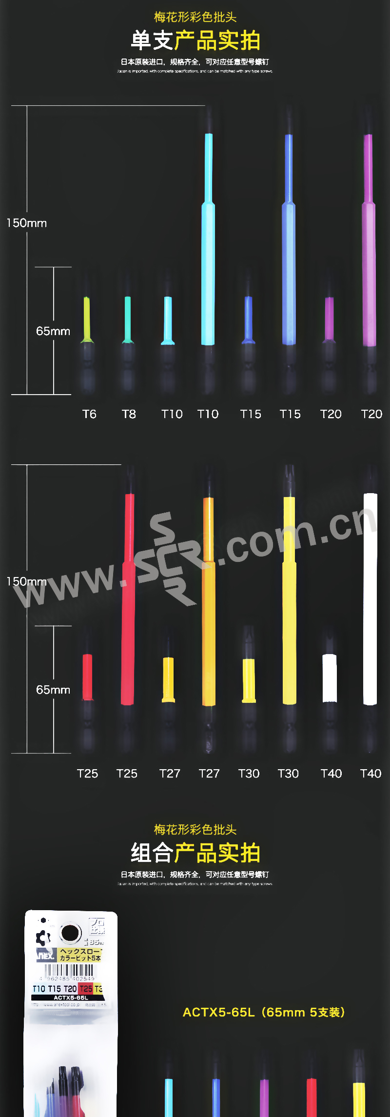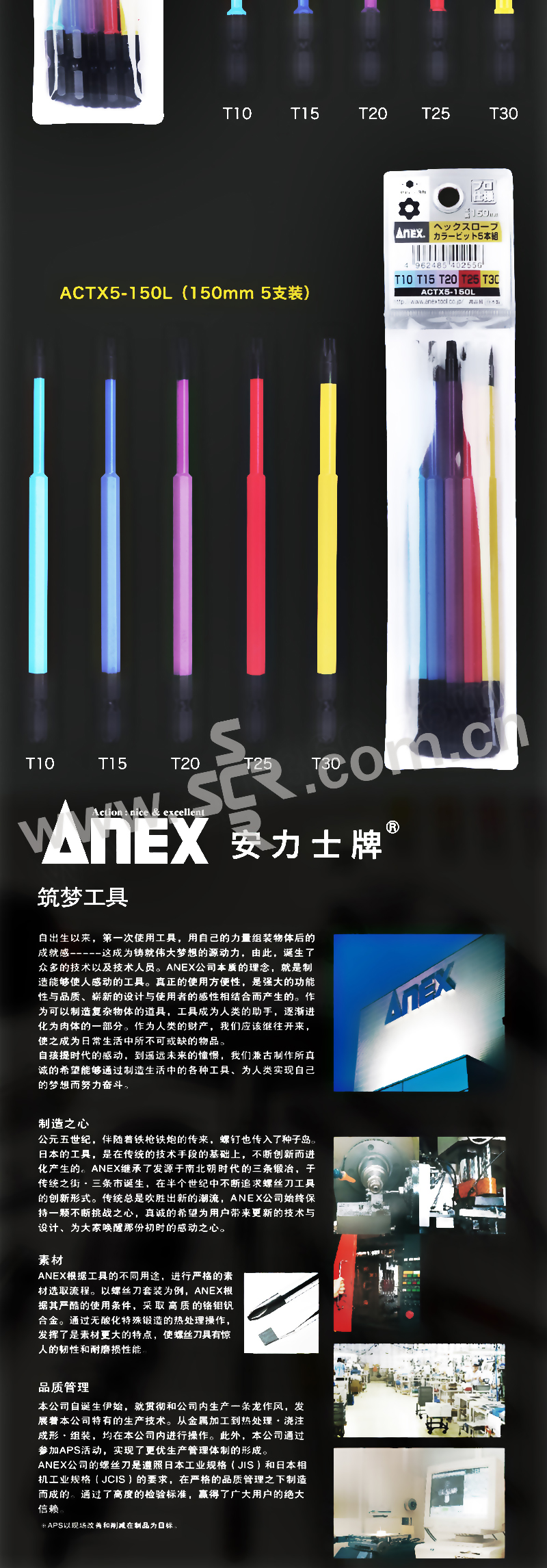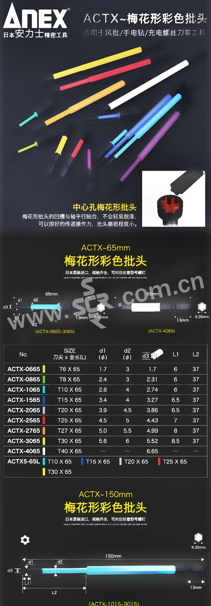 ANEX/安力士牌 进口中孔梅花星形彩色批头 ACTX5-65L T10 T15 T20 T25 T30 5支 1套