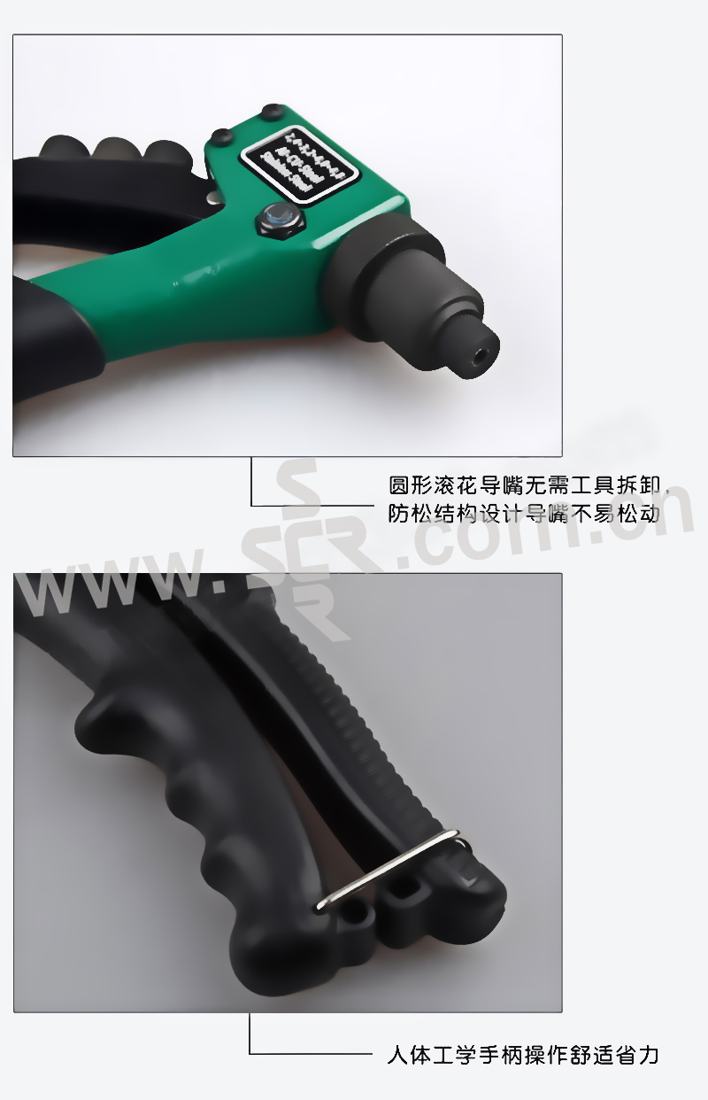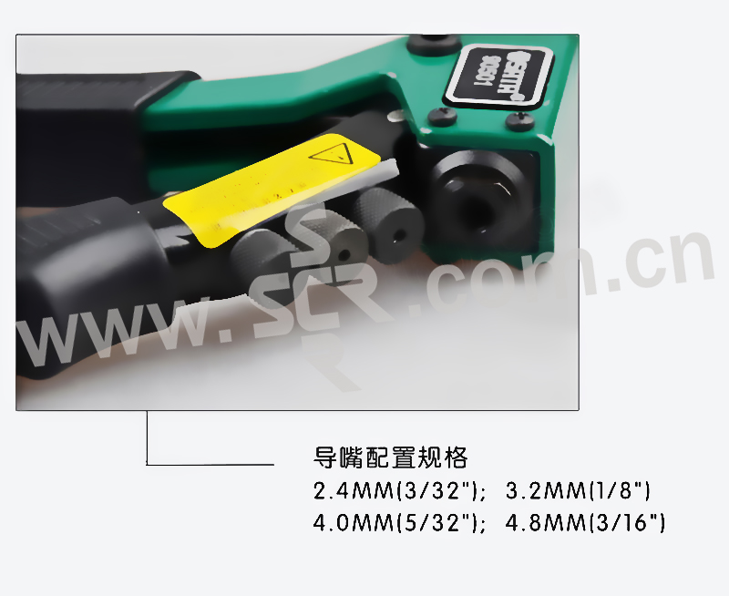 ·导嘴配置规格2。4MM(3/32")、3。2MM(1/8")、4。0MM(5/32")、4。8MM(3/16")。 ·圆形滚花导嘴无需工具拆卸,防松结构设计导嘴不易松动。 ·人体工学手柄操作舒适省力。