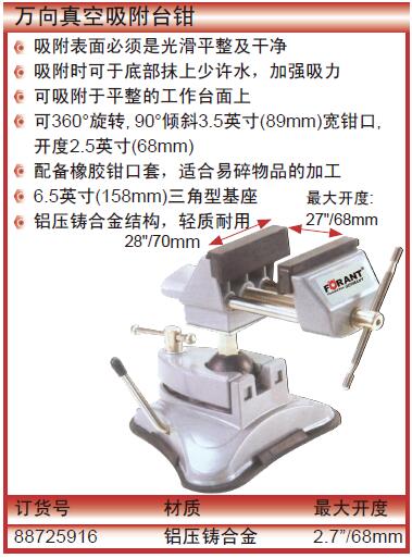 ·吸附表面必须是光滑平整及干净 ·吸附时可于底部抹上少许水,加强吸力 ·可吸附于平整的工作台面上 ·可360°旋转,90°倾斜3.5英寸(89mm)宽钳口, ·开度2.5英寸(68mm) ·6.5英寸(158mm)三角型基座 ·铝压铸合金结构,轻质耐用