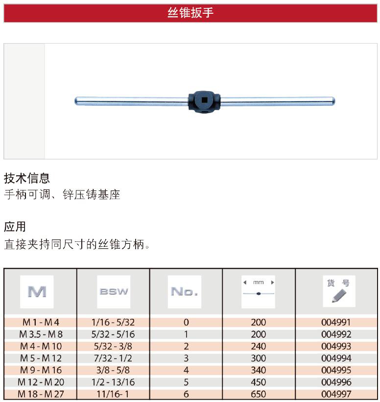·经久耐用,产品物美价廉 ·手柄可调,锌压铸基座,直接夹持同尺寸丝锥方柄