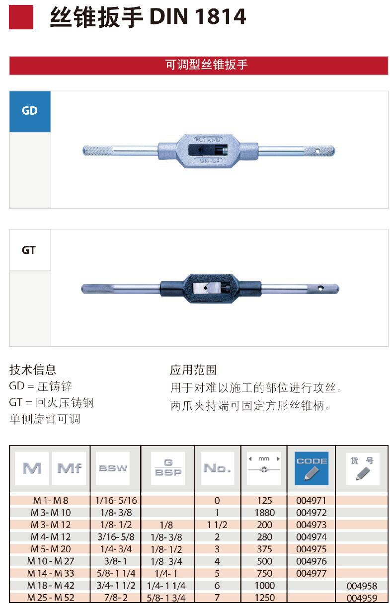 ·经久耐用,产品物美价廉 ·压铸锌;用于对难以施工的部位进行攻丝,两爪夹持端可固定方型丝锥柄