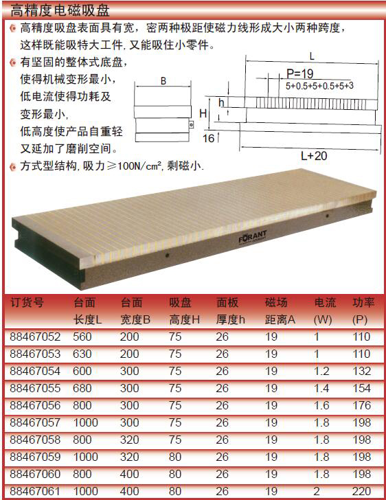·高精度吸盘表面具有宽,密两种极距使磁力线形成大小两种跨度,这样既能吸特大工件,又能吸住小零件。有坚固的整体式底盘,使得机械变形最小,低电流使得功耗及变形最小,低高度使产品自重轻又延加了磨削空间。