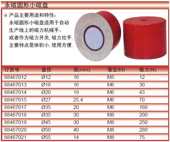 ·产品主要用途和特性:永磁圆形小磁盘适用于自动生产线上的磁力机械手,或者作为磁力开关,磁力拉手.主要特点是体积小,使用方便