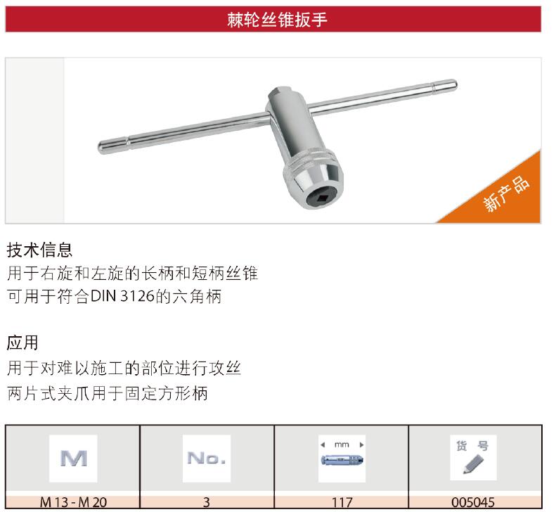 ·经久耐用,产品物美价廉 ·技术信息:用于左旋和右旋的长柄和短柄丝锥,可用于符合DIN3126的六角柄 ·用于对难以施工的部分进行攻丝,两片式夹爪用于固定方形柄