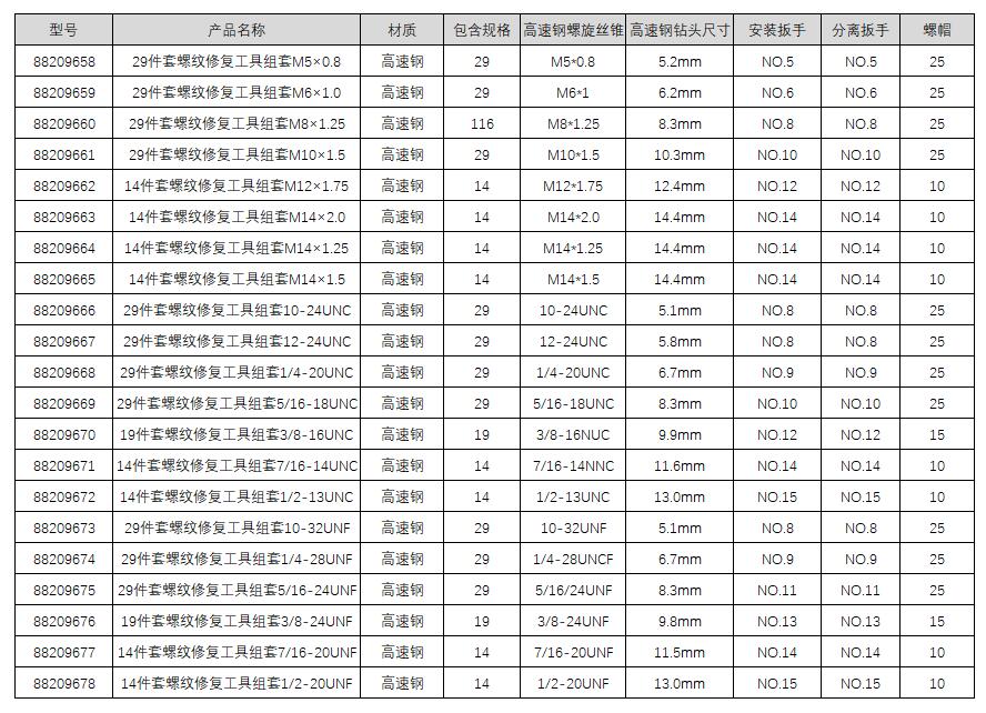 订货号 制造商型号 尺寸范围 数量 精度等级 刀具材质 高速钢螺旋丝锥 安装扳手 分离扳手 螺帽 价格 购物车