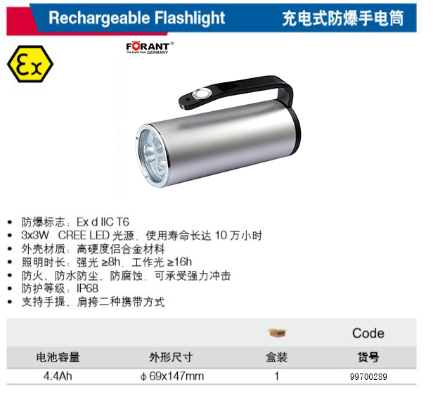 ·防爆标志:Ex ib Ⅱ C T4 ·3W CREE LED 光源,使用寿命长达10 万小时 ·外壳材质:轻质高硬度合金材料 ·照明时长:强光 10h,工作光 20h;另设有爆闪光功能 ·八棱灯头,在应急救援中可以用作砸窗救生工具使用 ·防护等级:IP65 ·支持手持、手腕吊挂、皮带套挂三种携带方式"