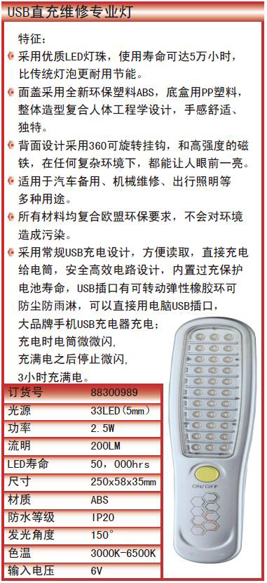 ·采用优质LED灯珠,使用寿命可达5万小时,比传统灯泡更耐用节能。 ·面盖采用全新环保塑料ABS,底盒用PP塑料,整体造型复合人体工程学设计,手感舒适、独特。 ·背面设计采用360可旋转挂钩,和高强度的磁铁,在任何复杂环境下,都能让人眼前一亮。 ·所有材料均复合欧盟环保要求,不会对环境造成污染。 ·采用常规USB充电设计,方便读取,直接充电给电筒,安全高效电路设计,内置过充保护电池寿命,USB插口有可转动弹性橡胶环可防尘防雨淋,可以直接用电脑USB插口, ·大品牌手机USB充电器充电;充电时电筒微微闪,充满电之后停止微闪,3小时充满电。