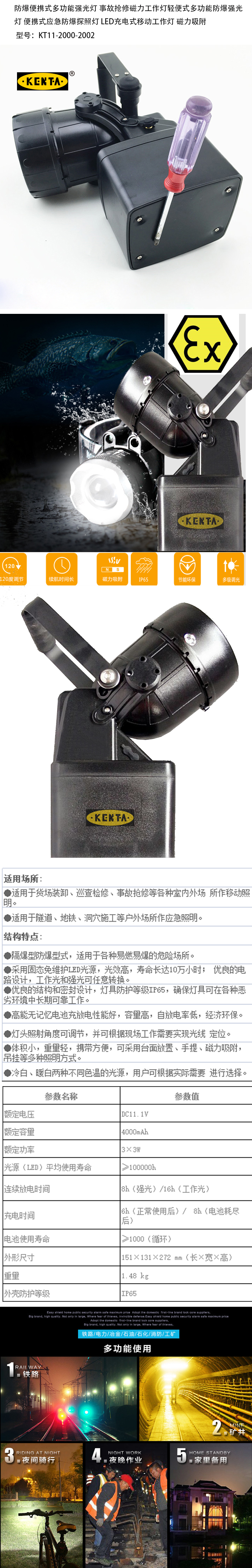 ·灯头照射角度可调节,并可根据现场工作需要实现光线定位。 ·KENTA/克恩达 EX防爆便携多功能LED充电式移动工作灯 KT11-2000-2002 151×131×272mm 1台