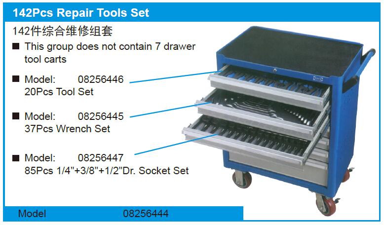 该组不包含7个抽屉 工具车 型号: 08256446 20件套工具 型号: 08256445 37件套扳手 型号: 08256447 85件1/4“+3/8”+1/2“套筒套件