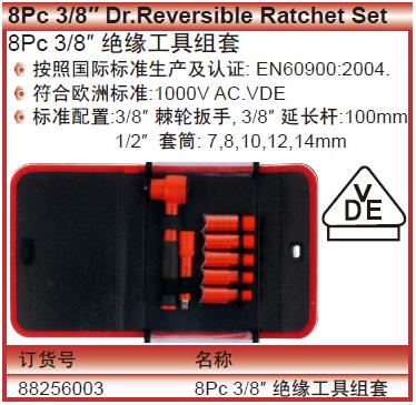 ·按照国际标准生产及认证:EN60900:2004. ·符合欧洲标准:1000VAC.VDE ·标准配置:3/8″棘轮扳手,3/8″延长杆:100mm ·1/2″套筒:7,8,10,12,14mm
