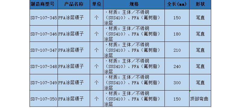 SLAMED PFA涂层镊子 150 SD7-107-350