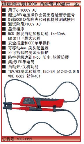 ·用于6-1000VAC ·超过35V电压操作会发出危险警示型号 ·0到500KΩ带响声和可视持续测试使用 ·测试阶段>100VAC ·显示相序 ·RCD触发自动加载功能,Is-30mA,ED(DT)=最大30秒 ·安全插座和CEE单手操作 ·可移动4mm尖头配置器 ·不可拆卸的测试头保护 ·防护等级达到IP65,防尘,软管防爆 ·集成LED手电筒 ·自动开/关机功能