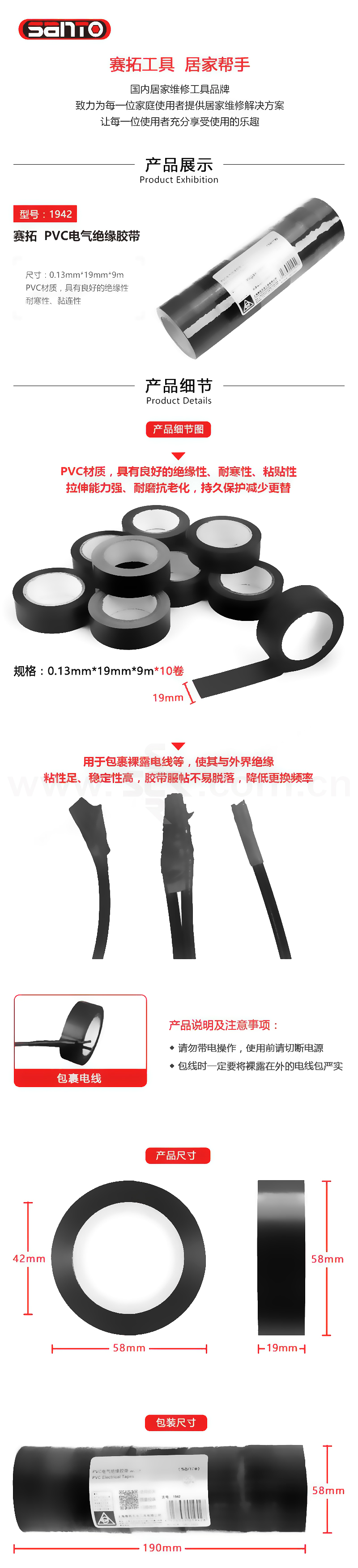 SANTO/赛拓 装电工绝缘胶带 1942 19mm×9m 10卷 1包