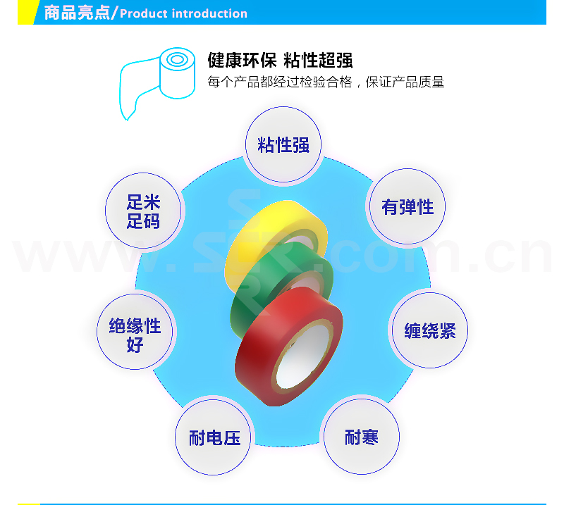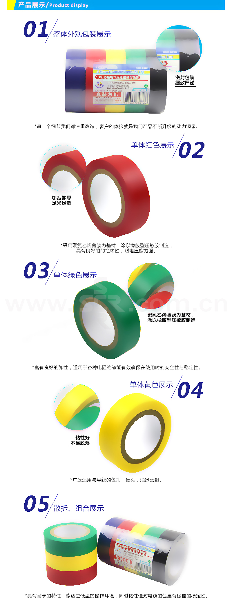 ·采用聚氯乙烯薄膜为基材,涂于橡胶型压敏胶制造,具有良好的绝缘性,耐压性和防水性