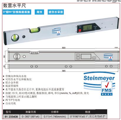 ·带横向和纵向水泡 ·可用作水平仪和倾角仪 ·铝合金外框 ·底面带磁性 ·水平面永久保存在芯片中,更换电池后不需重新置零按键:开/关,相对/绝对测量,数据保持,蜂鸣,单位(mm/m,%,in/ft)转换,背光 ·当底面朝上时显示随之翻转 ·两节7号电池 ·自动关机