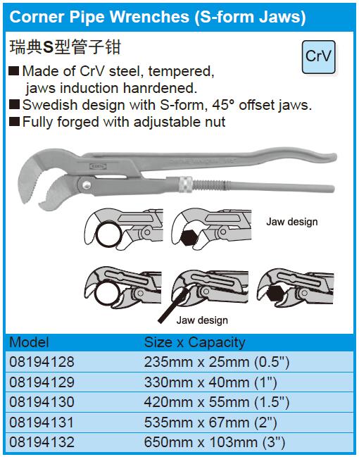 Corner Pipe Wrenches (S-form Jaws)