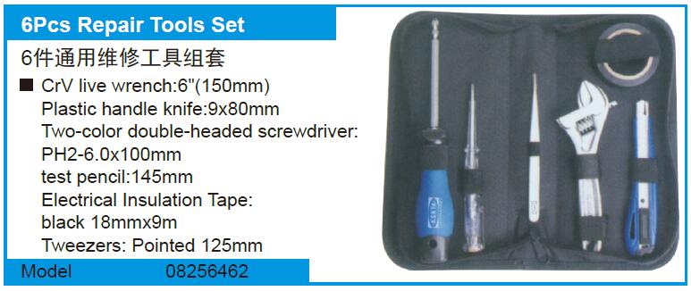 CrV活动扳手: 6" (150mm) 胶柄刀: 9×80mm 两色双头螺丝刀: PH2-6.0×100mm 铅笔: 145mm 电气绝缘胶带: 黑色18mm×9m 镊子: 尖头125mm