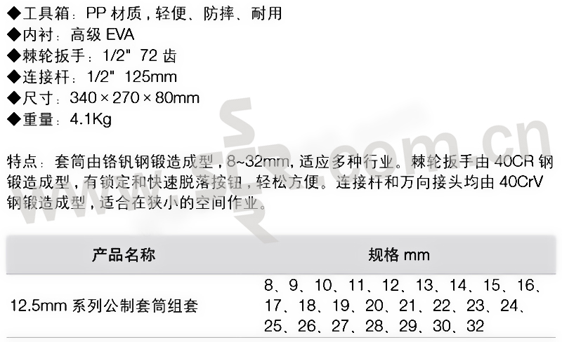 ·套筒由铬钒钢锻造成型,8~32mm,适应多种行业。棘轮扳手由40CR钢锻造成型,有锁定和快速脱落按钮,轻松方便。连接杆和万向接头均由40CrV钢锻造成型,适合在狭小的空间作业