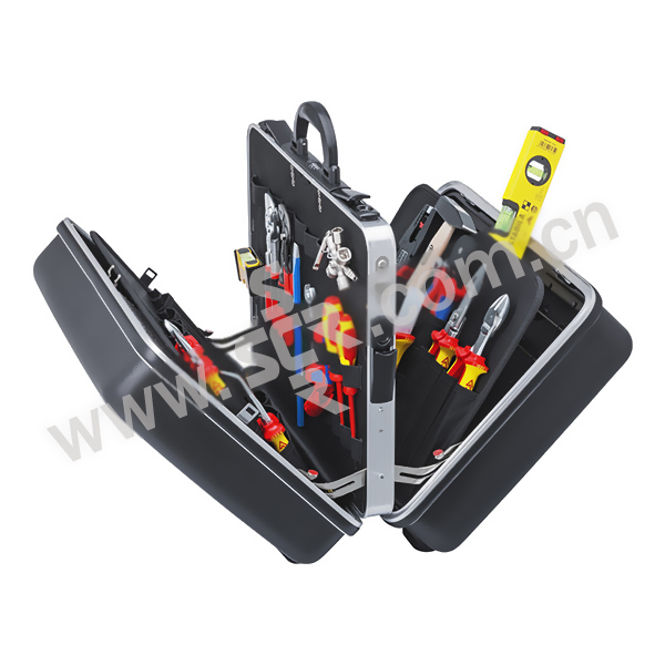 ·内含有65件高品质工具,绝缘产品经VDE测试,符合DIN EN 60900标准。·重载ABS材料外壳,用铝框加固。·舒适的手柄,可在箱底加装导轮,作为“拉杆箱”使用。·可单侧或双侧打开,底层和箱盖可单独打开。·两侧均带有箱盖固定器和铰链机制,可在任何开口位置平稳站立,并能在45°和90°位置放置。·3位密码锁和两个锁扣,可安全锁住工具箱。·两侧带拆卸文件袋和工具隔板,每侧各有13个工具插袋。·底部托盘高58mm,可灵活插入隔板进行细分