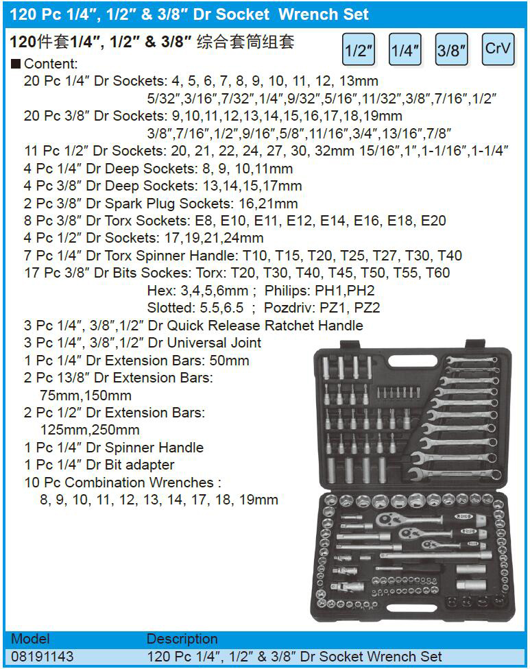 120件套1/4",1/2"&3/8"综合套筒组套
