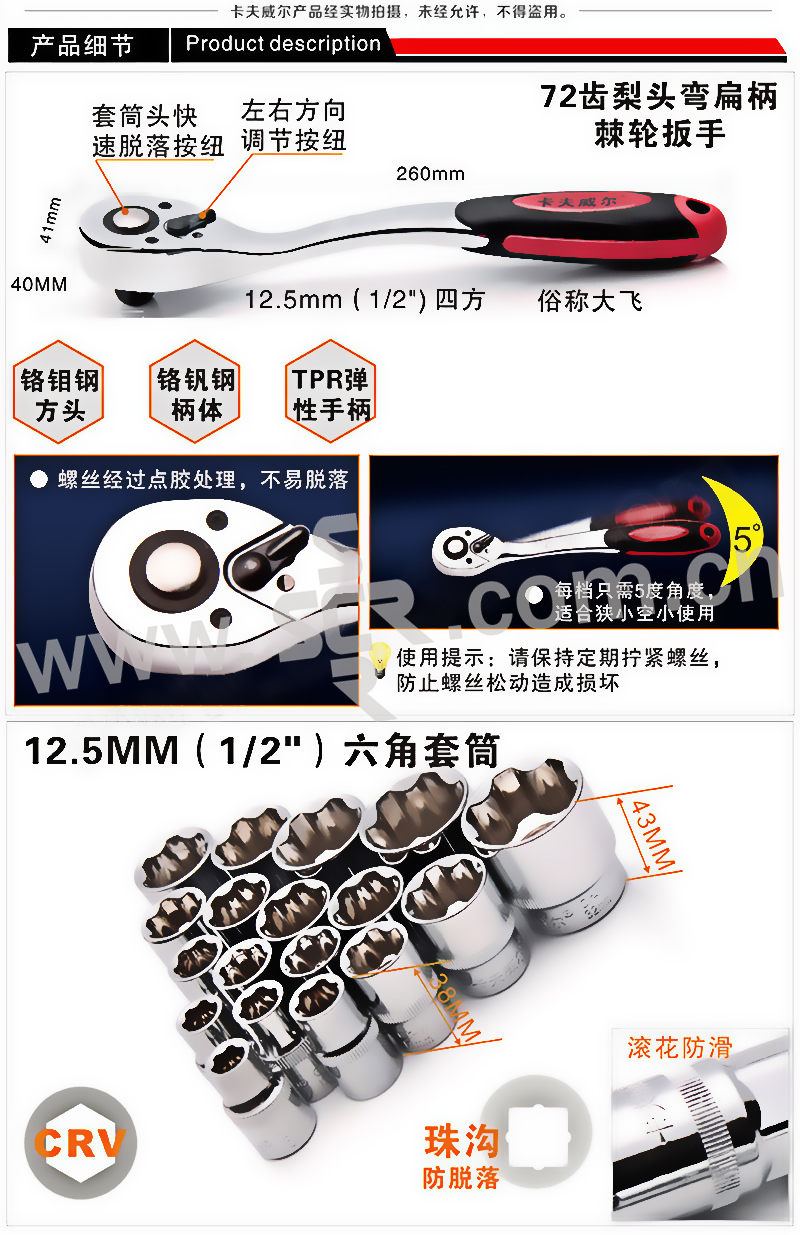 ·72齿梨头弯扁柄棘轮批,CRV材质