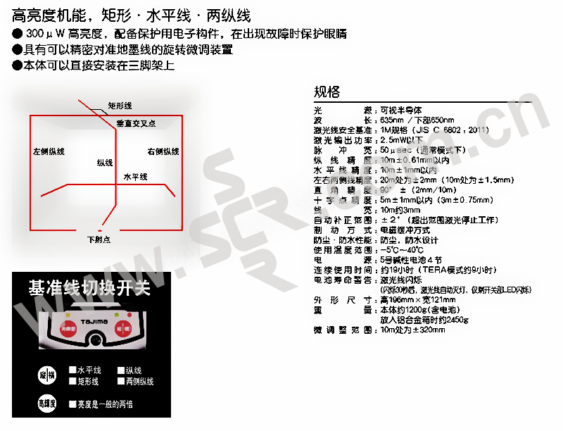 ·TERA高亮度机能,亮度是一般的两倍。 ·NAVI追尾机能。 ·用一台激光基准显示仪,可射出矩形、两垂直、地墨、水平、垂直交叉点等基准线。 ·采用LD的下射点,放置在三脚架上也可以清晰看到下射点。 ·采用半导体激光,小型轻巧,便于携带。 ·具有可以精密对准地墨线的回转微调装置。 ·具有旋转微调功能,可以精密调整下射点。 ·能够防止作业现场显示振动。 ·本激光产品可直接按装在专用三脚架上使用。
