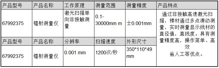 通过非接触高速激光扫描,棒材通过多点滑动测量,实时测量显示线材的直径值,直线度。 ·具有测量精度高,操作简单、高效省人工等优点。