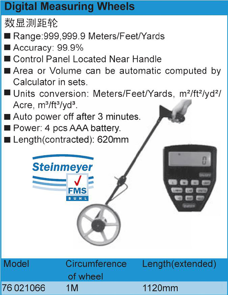 ·范围:999,999.9米/英尺码 ·准确度:99.9% ·控制面板位于手柄附近 ·面积或体积可以通过以下方式自动计算 ·计算器套。 ·单位换算:米/英尺/码,m3/ftlyd3y ·英亩,m/ftlyd3。 ·3分钟后自动关闭电源。 ·电源:4颗AAA电池。 ·合同长度:620mm