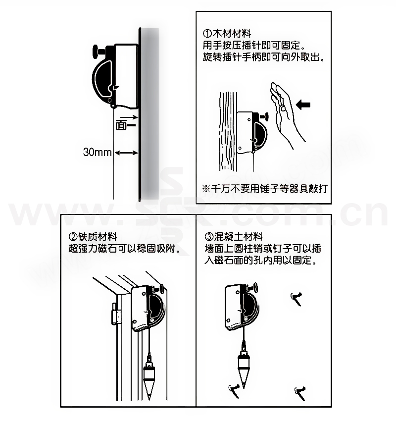 ·木材表面使用针,钢铁表面使用强力磁石固定。其他铝合金门窗,混凝土等也可以一键固定 ·附有吸着力强的磁石,体积小,轻便 ·插针可以直接插入木材中,旋转插针手柄即可顺利拔出 ·100g-400g的重锤均可使用,并附带无需调节平衡的自动调节平衡装置 ·附带可在混凝土材料上安装的圆柱销子及钉子 ·根据现场需要,有2个位置(面一、30mm)可用来设定挂线和固定面的距离) ·附带挂绳线粗:0.9mm(1010-2429)