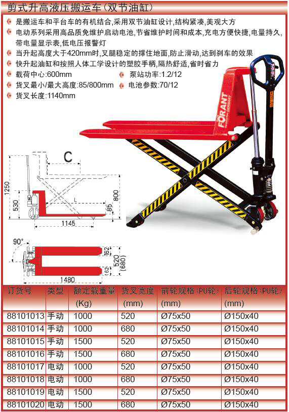 ·货叉最小/最大高度:85/800mm 电池参数:70/12